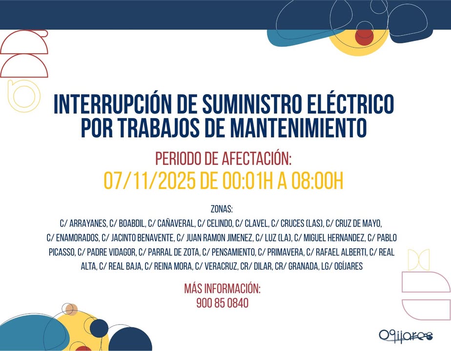 La empresa e-Distribución informa que el próximo viernes 7 de noviembre de 2025, entre las 00:01 h y las 08:00 h, se realizará una interrupción temporal del suministro eléctrico en diversas zonas de Ogíjares, debido a trabajos de mantenimiento y mejora en la red.