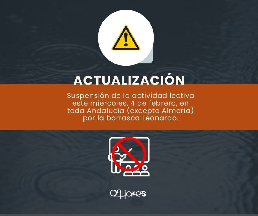 Debido al paso de la borrasca Leonardo y siguiendo las indicaciones de la Junta de Andalucía, se suspende la actividad lectiva este miércoles, 4 de febrero, en todos los centros educativos de Andalucía, excepto en la provincia de Almería.