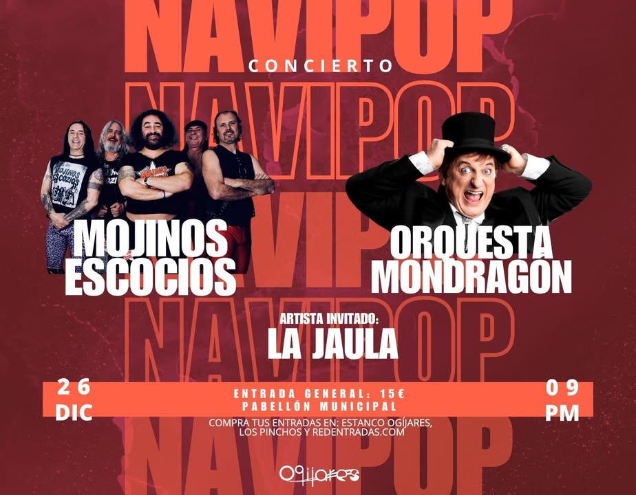 El próximo 26 de diciembre, Ogíjares vivirá una noche única con la Orquesta Mondragón y el inconfundible Javier Gurruchaga, junto a los divertidísimos Mojinos Escocios 🤘. Como artista invitado, tendremos al mítico grupo "La Jaula".